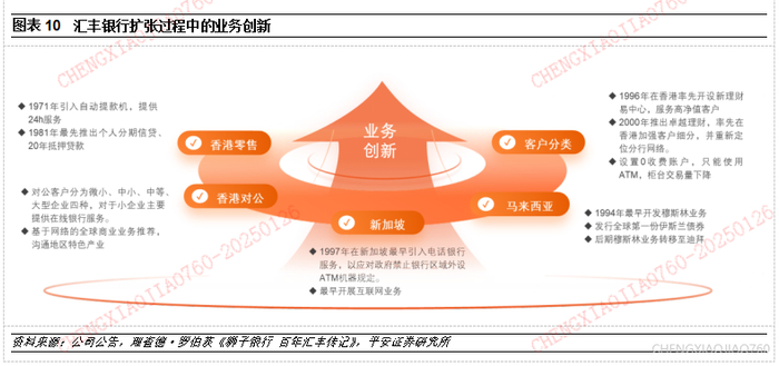 汇丰银行在香港进行了一系列产品和服务的创新:1)在服务方面,汇丰银行1971年最先在香港引入ATM自动提款机,为客户提供24h服务,降低了公司人工柜台的接待压力,降低人工成本。2)在产品方面,汇丰银行在香港最先推出个人分期贷款和20年长期抵押贷款,拓宽了客户在贷款过程中的选择。3)在客户分类方面,汇丰银行1996年就在香港开设理财易中心,服务高净值客户,并在2000年推出卓越理财,为高净值客户提供差别化的服务,与此同时,汇丰对其分行网络进行重新定位,将部分分行设置为卓越理财分行,专门用于服务卓越理财客户,进一步凸显高净值客户的重要性。对于普通客户,汇丰设置了0收费账户,仅对其提供ATM机服务,进一步降低了柜台的交易量,降低人力成本。