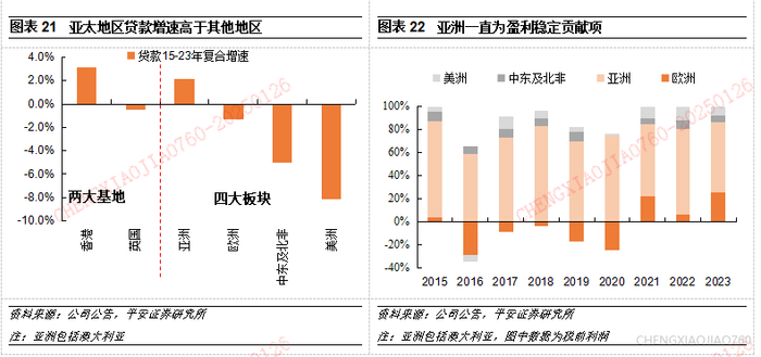 汇丰借助在香港地区的优势,迅速拓展亚洲市场,并拉动了银行整体的贷款和盈利。1)汇丰银行在亚太地区的贷款增速明显高于其他地区,从英国、香港两大基地来看,据公司公告,香港2015-2023年间贷款复合增速为3.2%,英国贷款增速为-0.5%;从亚洲、欧洲、中东及北非、美洲四大板块来看,2015-2023年间仅亚洲实现正增,复合增速为2.1%,其他三大板块贷款复合增速均为负值,当地经济内生动力一定程度上影响居民信贷需求,进而影响汇丰贷款投放。2)从盈利情况来看,2020年以前,欧洲地区业务大多亏损,2021年后逐步转正。亚洲业务盈利稳定,在全行中占比较高,大多超过70%,在汇丰银行的长期经营中,亚太地区成为汇丰收益稳定来源。