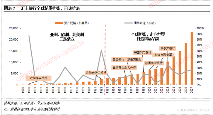 汇丰银行在20世纪80年代到21世纪初期在全球范围迅速扩张,据公司公告,资产规模从1980年的473亿美元扩张到2007年金融危机前夕的2.35万亿美元,1980-2007年间复合增速为16%。在全球扩张的过程中,可以1992年完成收购米特兰银行为节点,分为区域扩张和全球扩张两个阶段,也体现出汇丰银行国际布局和全球化战略调整从重点地区向全球扩张的过程。