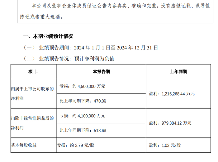 预计2024年净利润亏损约450亿元同比下降470%