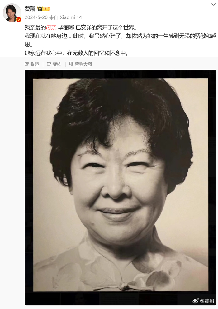 此前,费翔经常公开发文分享和母亲生活的细节,母子俩感情十分要好。2024年5月20日,费翔发文透露母亲去世:“她永远在我心中,在无数人的回忆和怀念中。”