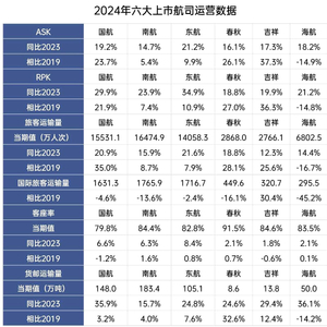 近日,南方航空、中国东航、中国国航、海南航空、春秋航空、吉祥航空等多家上市航司也相继披露2024年全年运营数据。从全年旅客恢复情况看,六大上市航司总旅客量为58501.0万人次,超过2019年11.9%。其中中国国航、吉祥航空和春秋航空三家总体旅客均超过2019年同期二成水平,分别同比增长35%、28.1%、25.6%。