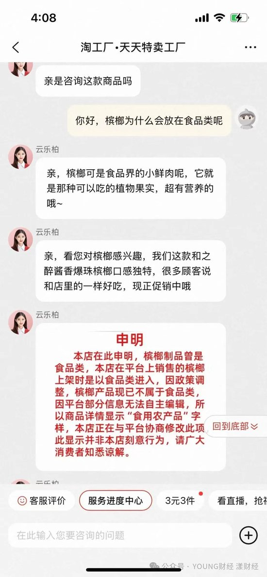 YOUNG财经询问淘工厂客服将槟榔列入食品的原因,淘工厂客服表示,“槟榔可是食品界的小鲜肉呢,它就是那种可以吃的植物果实,超有营养的哦”。