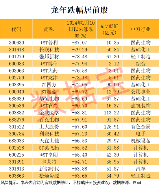 27只股票龙年累计下跌超50%,其中*ST普利、长联科技、强邦新材、*ST博信、*ST大药、*ST龙津、红四方累计跌幅超70%。