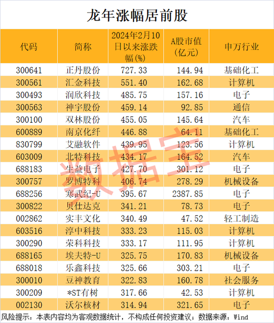 从个股方面来看,据数据宝统计,龙年期间共逾4200股录得正收益,其中397股累计涨幅翻倍。正丹股份、汇金科技、润欣科技、神宇股份、双林股份累计涨幅排在前五位。