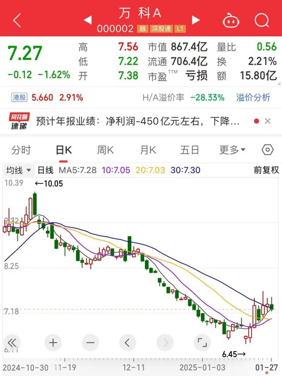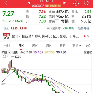 据万科A业绩预告,公司预计2024年净利润亏损约450亿元,上年同期盈利121.63亿元。报告期内,公司房地产开发项目结算规模和毛利率显著下降;新增计提了信用减值和存货跌价准备;部分非主业财务投资出现亏损;部分大宗资产交易和股权交易价格低于账面值。