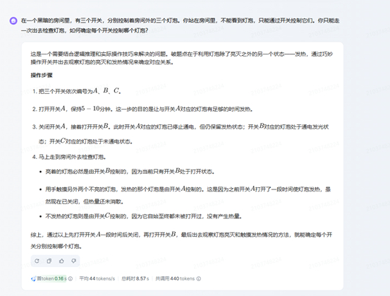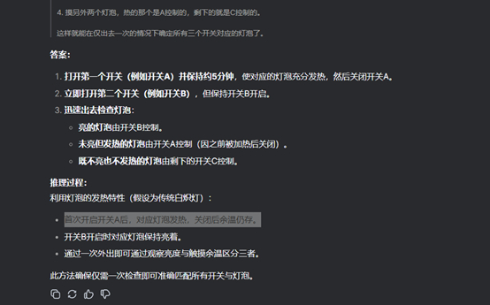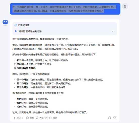 首先,记者选择了一道简单的思维问题:在一个黑暗的房间里,有三个开关,分别控制着房间外的三个灯泡。你站在房间里,不能看到灯泡,只能通过开关控制它们。你只能走一次出去检查灯泡,如何确定每个开关控制哪个灯泡?