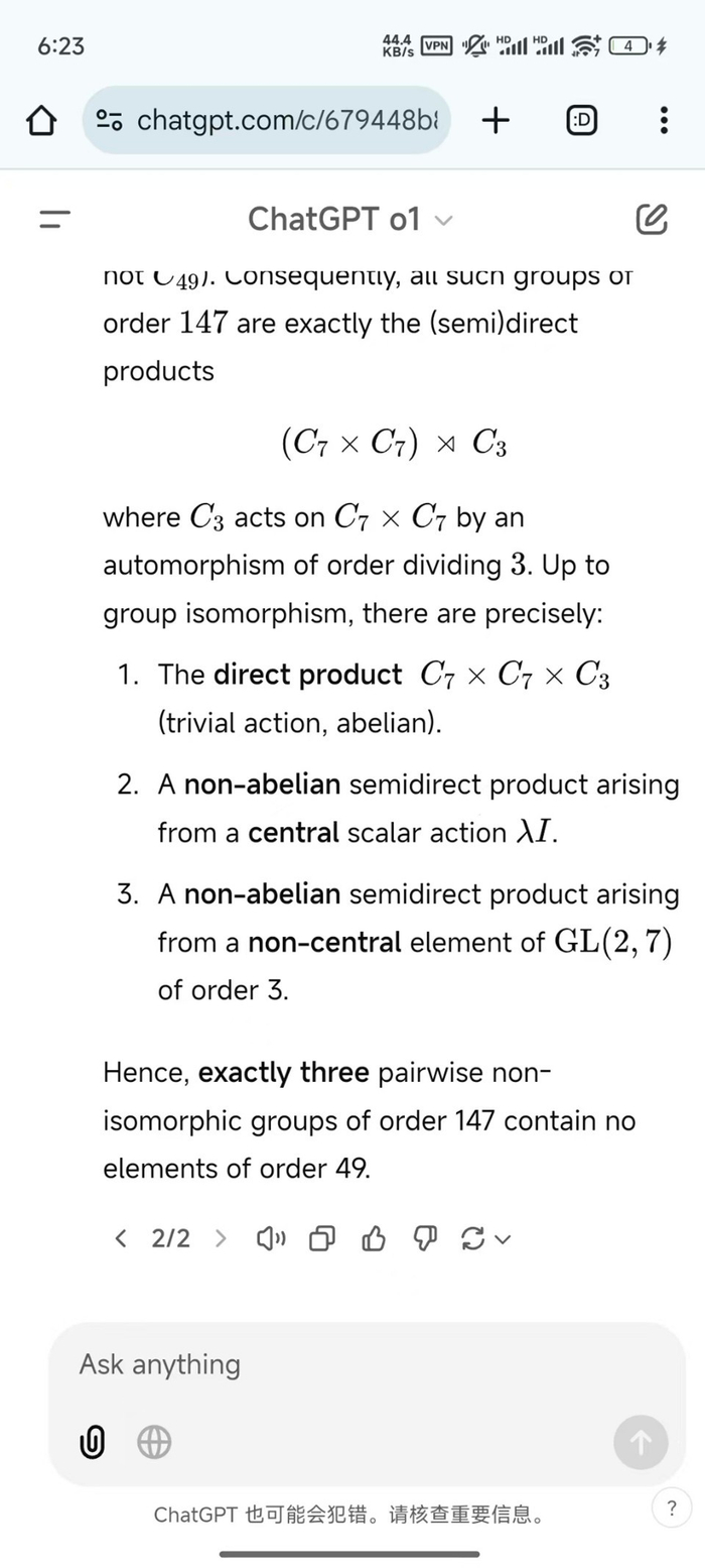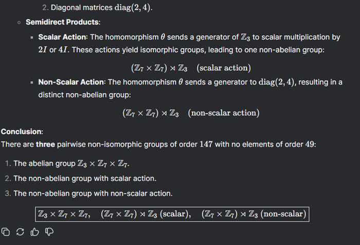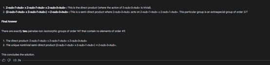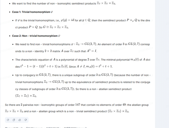 评测结果显示,DeepSeek在科学领域如数学能力上排名第一。于是,记者找来了一道研究生级别的数学题进行测试:找出所有阶为147且不包含阶为49的元素的两两不同同构群(出自美国南加州大学博士资格考试)。