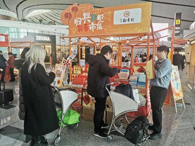 1月24日,位于北京大兴国际机场航站楼F2层的“归兴肆见”——2025年新春特色商业市集热闹非凡,吸引了不少旅客驻足选购,浓浓的“新年味”扑面而来。