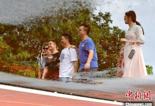 朱伟贤(右三)与“看到”组合成员们一起在操场散步。中新社记者 吕明 摄