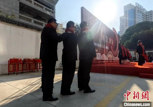 林鹏(左一)、黄延平(中)、陈炎明正在候场。中新社记者 吕明 摄