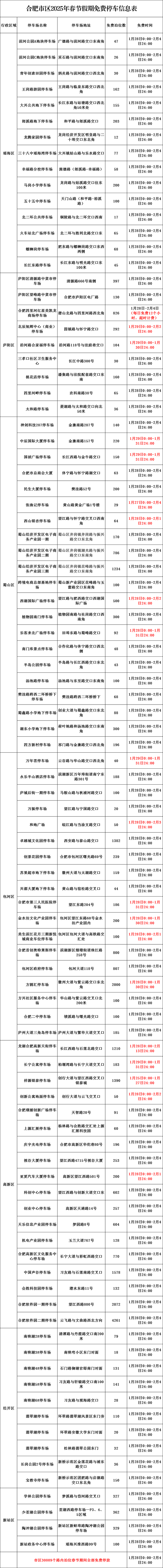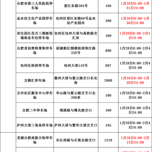 为持续推进“暖民心行动”,缓解春节期间市区“停车难”,保障市民新春佳节出行停车便利,合肥市城管部门联合市公安交警部门、市泊车集团及部分停车场运营企业推出“春节免费停”活动。本次活动累计推出市区免费停车场95个、免费泊位30796个;市区30809个路内泊位春节期间全部免费停放。