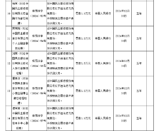 杨某(时任中国民生银行股份有限公司金融市场部总经理)、贾某刚(时任中国民生银行股份有限公司个人金融部副总经理)、刘某(时任中国民生银行股份有限公司私人银行部副总经理)、屠某俊(时任中国民生银行股份有限公司小微金融事业部总经理助理)、谭某慧(时任中国民生银行股份有限公司信用卡中心副总裁)、任某龙(时任中国民生银行股份有限公司交易银行部总经理)对中国民生银行股份有限公司未按照规定履行客户身份识别义务负有责任,均被罚款3.5万元。