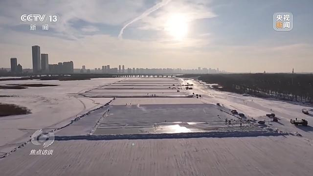 松花江的江面上,下一个冰雪季的采冰工作已经开始了。