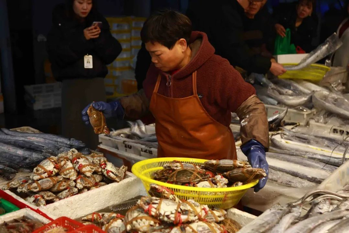 消费者陆女士刚买了一只珍宝蟹,她表示自己并不太在乎价格,“毕竟过年总要有个大菜,在菜场买活杀的海鲜更新鲜,家里长辈也喜欢,我每年都来的。”