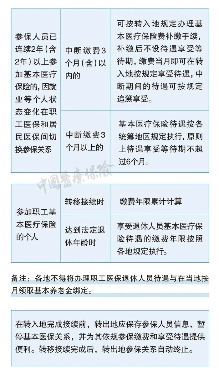 在这个文件中,对医保关系的转移接续,在全国层面上统一了经办流程,规范了待遇衔接。看完这张图,大家就能搞懂医保的转移接续。