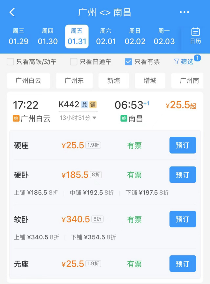 例如,1月31日~2月2日(即大年初三至年初五),从广州白云开往南昌的K442列车有1.9折的票在售,其中,硬座、无座票为25.5元,原价票为135.5元;1月24日~25日(即大年二十五至大年二十六),由长沙开往广州北的K9275列车有2折票在售,硬座、无座的票价仅为18元,原价票为93元。