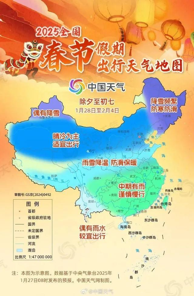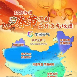 春节假日期间(除夕至初七),西北、华北等地气温偏低;除夕至初二,新疆北部、东北地区等地有降雪;初二至初五,南方地区有一次雨雪天气过程;初五至初七还将有冷空气影响中东部地区。
