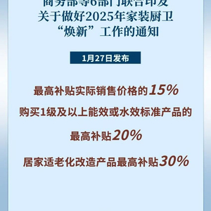 27日,商务部等6部门办公厅发布《关于做好2025年家装厨卫“焕新”工作的通知》,对消费者开展旧房装修、厨卫等局部改造、居家适老化改造所用物品和材料购置,各地将结合实际自主确定补贴品类、标准、限额和实施方式。哪些产品可以补贴?补贴标准又是多少?