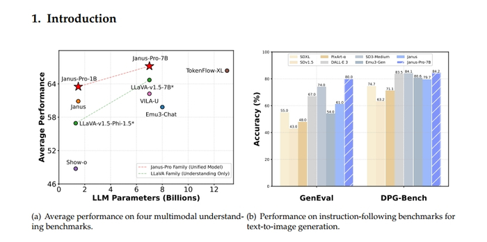 在用R1模型震撼硅谷和暴击华尔街之后,DeepSeek又在深夜放大招。1月27日晚间10点左右,DeepSeek85后创始人梁文锋在社交平台上X上表示,DeepSeek新版本即将发布。三个多小时后,人工智能开源社区HuggingFace就显示,DeepSeek发布了参数大小从10亿到70亿不等,名为Janus-Pro和JanusFlow的一系列开源多模态模型。本次发布的新模型,重点在于文生图能力方面。
