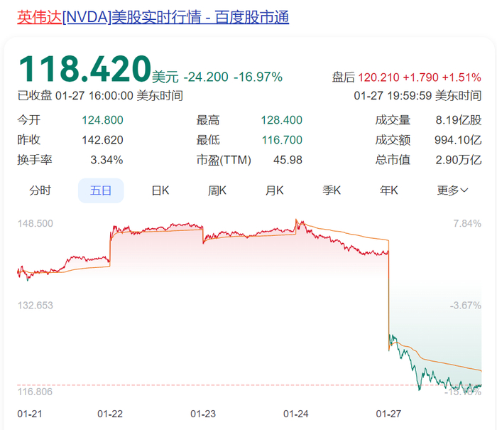 1月27日美股收盘,英伟达收盘大跌近17%,市值蒸发近6000亿美元(约合人民币4.3万亿元),创历史上最大单日个股蒸发规模,直接跌穿3万亿美元市值大关,今年以来股价涨幅瞬间为负。