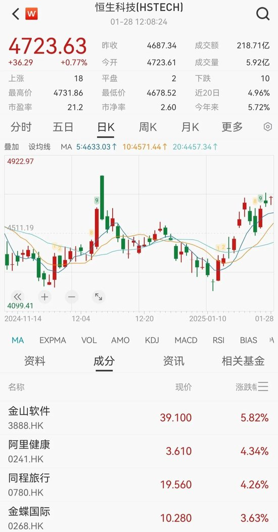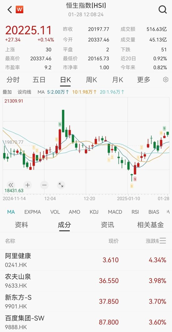 1月28日,春节假期,港股半天交易收盘。其中恒生指数上涨0.14%,实现三连阳,创一个半月新高。恒生科技指数更强劲,上涨0.77%,本轮自低点以来累计上涨已超10%。
