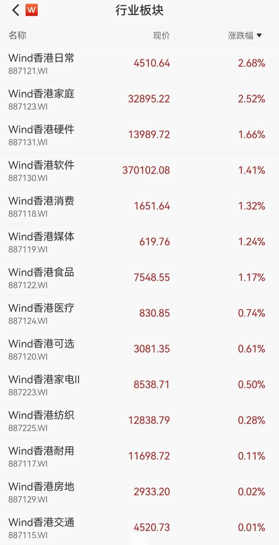 从Wind港股行业板块上看,港股半日交易中日常消费零售、家庭用品受追捧,涨幅最大均超过2.5%。紧随其后硬件设备、软件服务、消费者服务、媒体娱乐和食品饮料板块涨幅也不小都在1%以上。而国防军工、有色金属等行业板块跌幅大,超过2%。