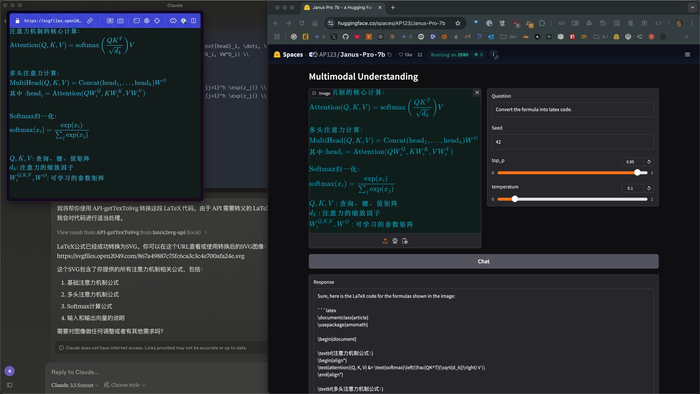 在外网,有网友测试了读图能力,表示Janus-Pro-7B的高精度读图能力很优秀,其发布的截图显示,在多行复杂数学表达式混合排版的图片转Latex代码,以及手绘风格时序图图片转mermaid代码的测试中,都是通过一句话Prompt实现了读图。