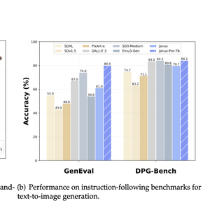 根据DeepSeek的技术文档,这个模型既能让AI读图,又能让AI生图。在文生图GenEval和DPG-Bench基准测试中,Janus-Pro-7B的准确率较前代Janus大幅提高,准确率测试结果分别为80%和84.2%,高于包括OpenAI DALL-E 3、Stable Diffusion在内的其他对比模型。