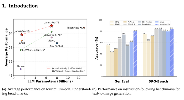 1月28日凌晨,人工智能社区Hugging Face显示,DeepSeek发布了开源多模态模型Janus-Pro,拥有10亿和70亿参数规模,相比此前的语言和推理模型,本次发布的新模型重点在于文生图能力方面。