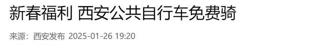 西安公交集团公共自行车公司延续以往惠民措施,春节期间(2025年1月28日-2025年2月4日)市民用户可免费骑行公共自行车。