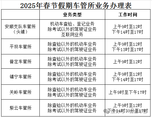黔东南州公安局交通警察支队车辆管理所采取线上与线下相结合的方式,从2025年1月28日—2025年2月4日(除夕至初七)正常上班。一、黔东南州(凯里市)车管服务网点
