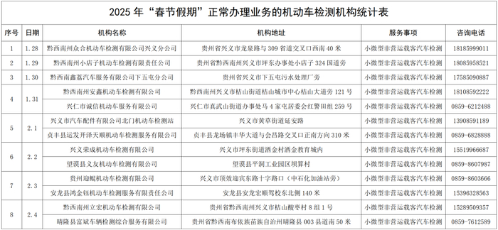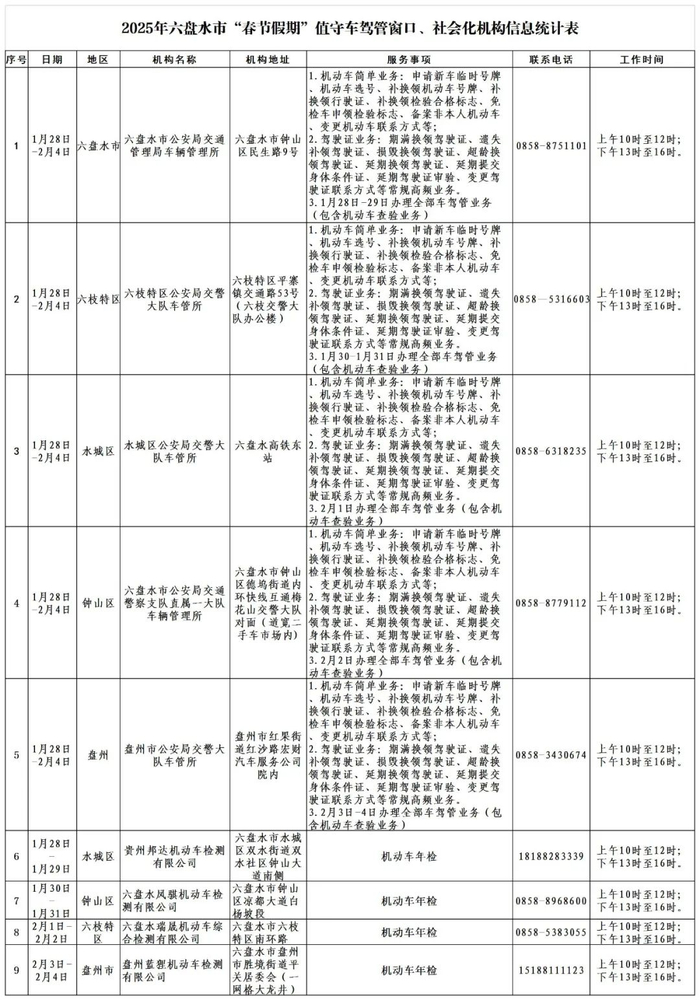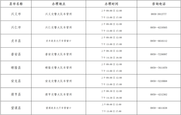 1.黔西南州公安局交警支队车管所窗口业务办理时间:2025年1月28日至2月4日,上午9:00至12:00,下午13:00至17:00。办理地点:黔西南州公安局交警支队车管所机动车直通式服务大厅,咨询电话:0859—3119197。