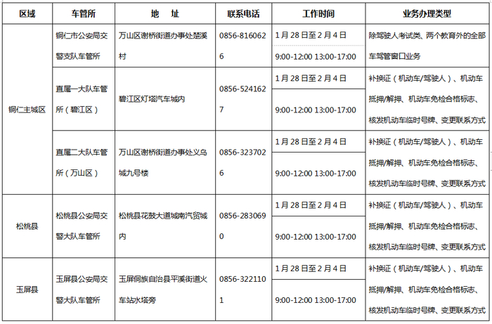 铜仁市公安交通管理局车管部门推行“节假日不打烊,服务不断档”服务措施。2025年“春节”假期,全市车管所正常上班。业务咨询办理可拨打各车管所联系电话,具体办理相关事项见附件。
