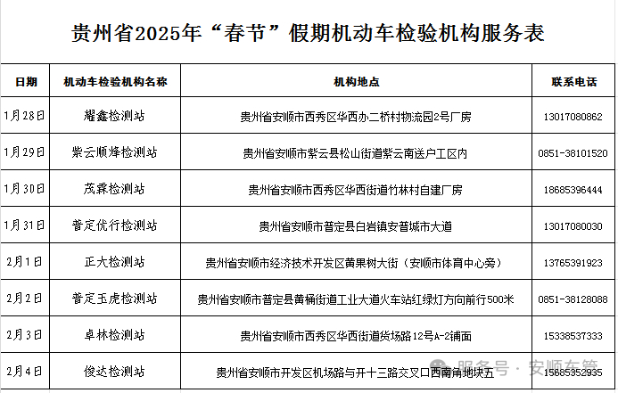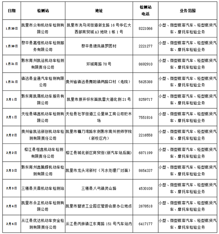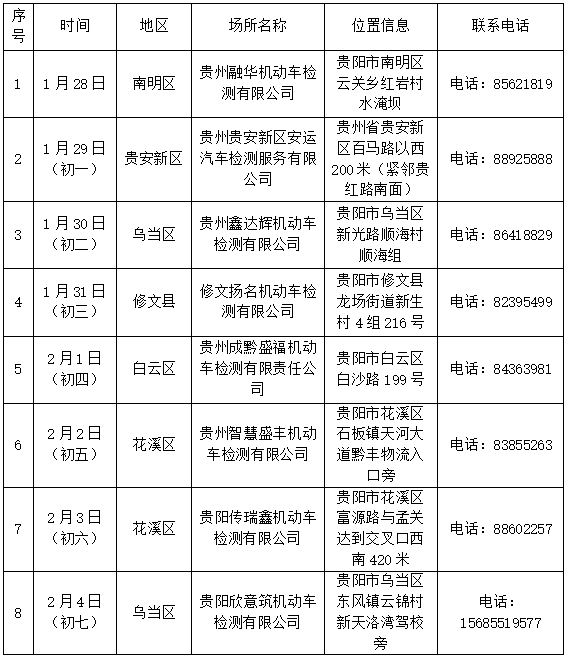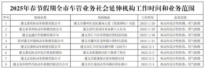 (二)为便利群众在春节假期办理车辆检验业务,遵义市辖区部分机动车检测站可正常办理车辆检验业务(详见附件)。