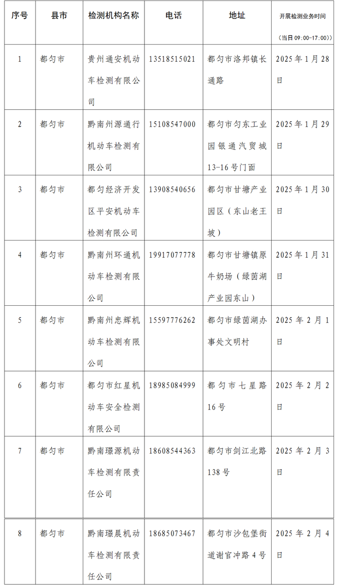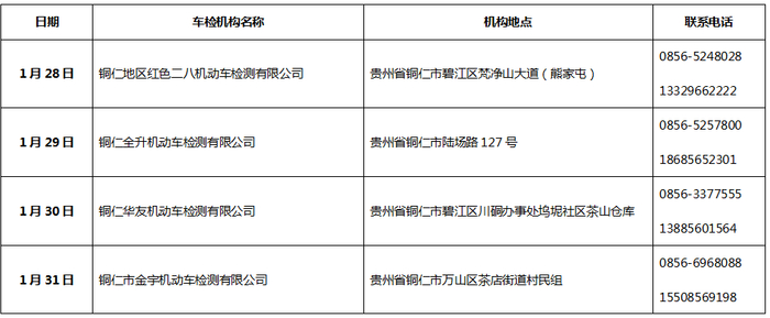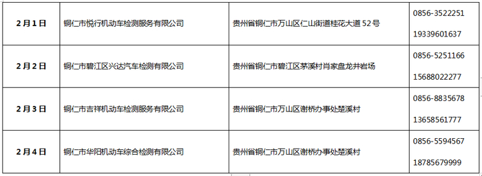 另外为解决“春节”假期群众车检需求,铜仁市公安交通管理局及辖区部分机动车检测机构,在春节假期期间,正常开展车检服务,车主可自行选择前往办理。现将提供车检服务机动车检测机构信息公示如下: