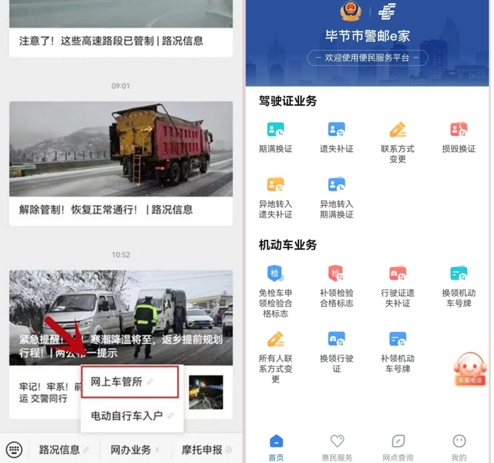 “春节”期间,广大车主、驾驶人可通过以下几种方式办理车驾管相关业务:一、关注“毕节交警”公众号,通过“网上车管所—警邮e家”可办理补换驾驶证、补换行驶证、查询无车证明等业务,也可以预约办理车辆入户等机动车查验类业务。