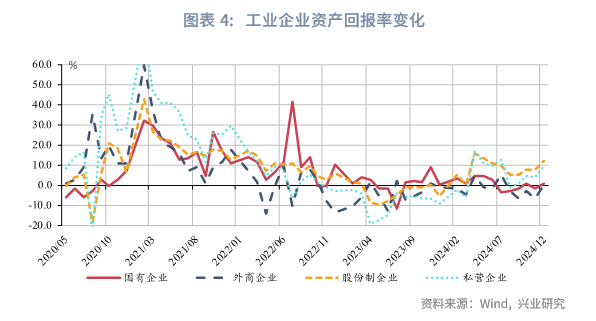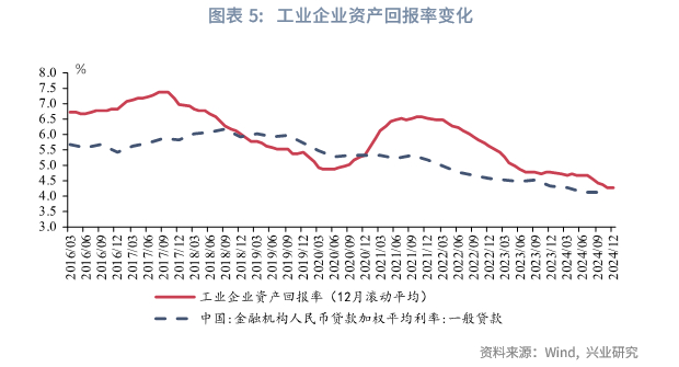 从资产回报率来看,2024年12月资产回报率止跌回升。随着营收带动利润改善,2024年12月资产回报率(12月滚动平均)较前月回升0.01个百分点至4.3%,结束自2024年4月以来的连续下跌。
