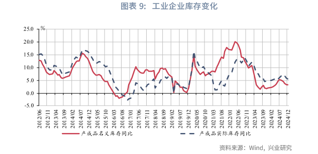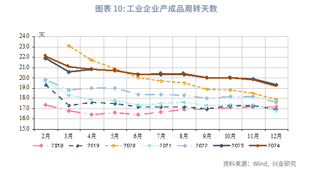 工业企业库存同比同上月持平。12月库存同比增速录得3.3%,同上月持平,结束自2024年7月以来的持续下降。产成品周转天数季节性下降,较上月下降0.6天,录得19.2天。