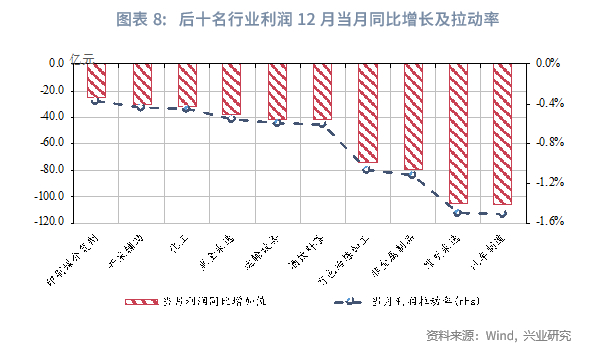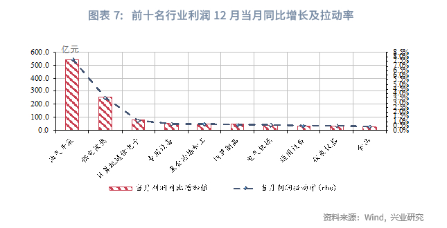 从利润率外的量、价因素来看,12月工业增加值增速较上月提高0.8个百分点,PPI同比较上月提高0.2个百分点,亦对利润回升有所支撑。