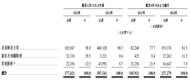 国星宇航的收入来自利用卫星遥感数据及灵境引擎的星基解决方案、卫星及相关服务(包括有效载荷、平台及卫星研发、组装、测试、发射协调、在轨交付及运营管理)、其他服务(包括智能停车解决方案及软硬件代理服务)。