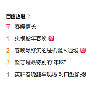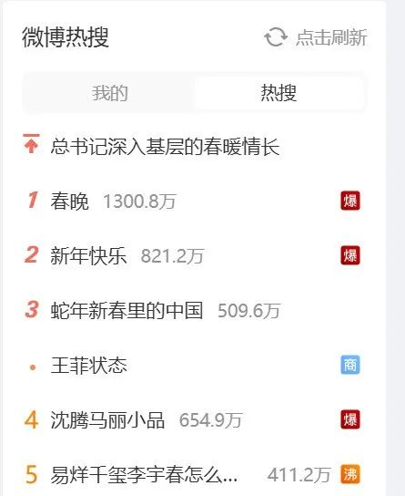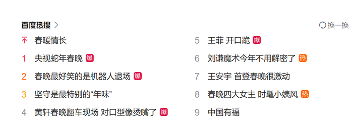除夕夜,央视春晚如约登场,歌曲、舞蹈、相声、小品、戏曲、武术、魔术等各类型节目应接不暇。当晚,微博热搜、百度热搜都被春晚“霸屏”了。