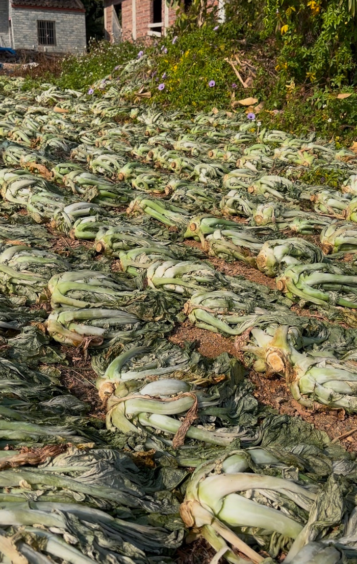 “远一些的那片梅菜,块头更大,再过一段时间就可以收割了。”罗谷雄领着记者,一边说一边朝着田野更深处走去。据罗谷雄介绍,梅菜从种植到收割大概需要90到120天,一般在秋冬时种植,到了春节前后就可收成。今年,罗谷雄的梅菜田长势不错,每亩收成可达到约8000斤。