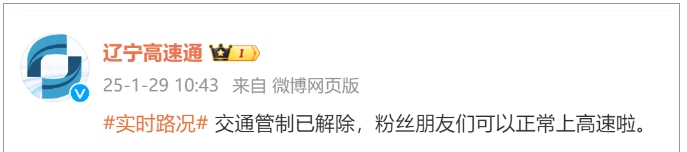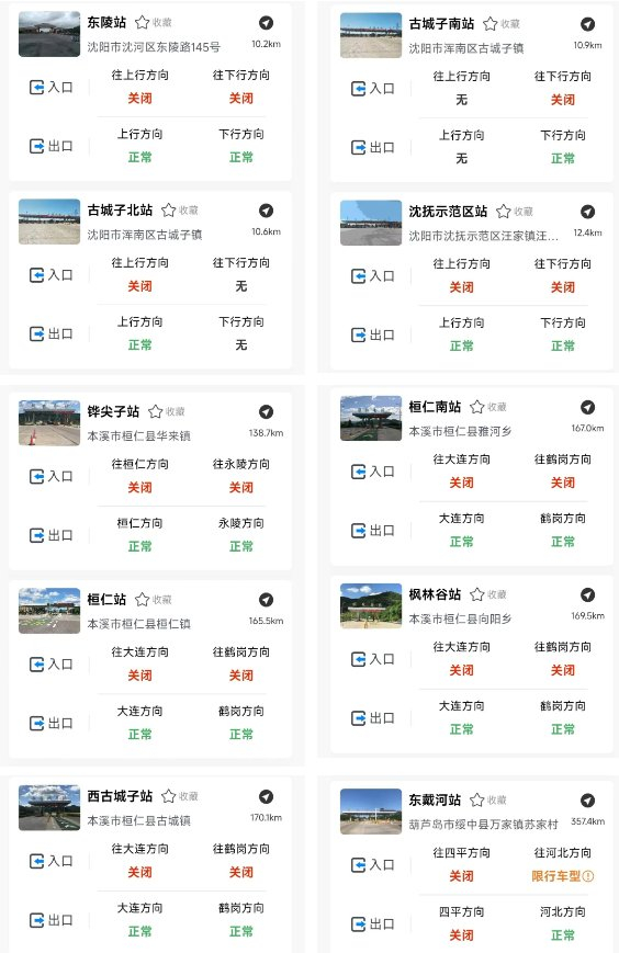 不过受到持续强降雪的影响,沈阳的朱尔屯、白塔堡、北李官、沈阳西、王家沟,本溪可上绕城高速,青年大街收费站只能到桃仙,大连、本溪,鞍山、阜新地区的高速公路七座以下小型车可通行。营口、辽阳、铁岭地区的高速公路部分封闭,丹东、锦州、朝阳、营口地区的高速公路虽然开通,但站口都有限制车型的要求。另外,沈阳、盘锦地区部分站口封闭,部分站口限型。