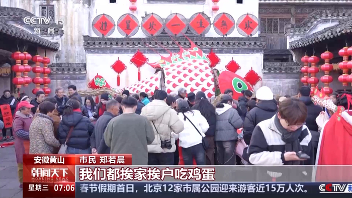 安徽黄山市民 郑若晨:每年过年的时候,我们都挨家挨户吃鸡蛋。以前经济没有这么发达的时候,鸡蛋就是一个比较好的东西,拿出来招待客人。我们徽州人还是蛮延续传统的春节习俗的。