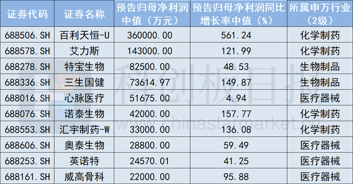 以各家公司已披露的归母净利润数据,及经计算后的归母净利润中值为准,目前已披露全年业绩预告的科创板医药公司中,共有30家实现盈利。