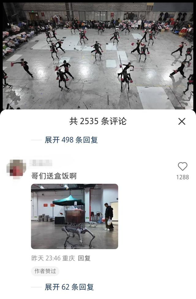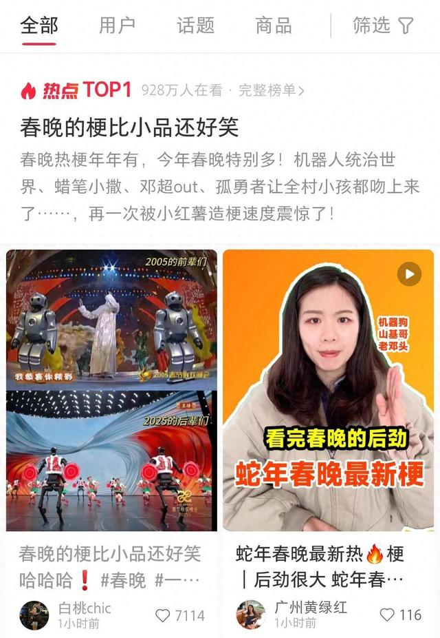今年讨论热度最高的节目是张艺谋导演的机器人创意舞蹈节目《秧bot》,围绕该节目的讨论从除夕夜播出到大年初一都在小红书中刷屏,有人把今年春晚转手绢超乎神技的机器人和2005年春晚中亮相的动作有点笨拙缓慢的机器人“前辈”作对比,还有人在热议机器人穿大花袄:“在中国,高科技机器人也得老老实实给七大姑八大姨表演节目”“赛博秧歌队还是出现了”“高度近视的我以为是外国人在扭秧歌”“也不知道笑点在哪里,但是看一次笑一次”,扭秧歌的机器人也硬控了小红书上的一众外国用户,有美国网友留言“我不知道用什么词来形容你们,太酷了。”机器人的研发公司宇树科技在小红书上也发布了在后台机器人的“排练”过程,视频中一个送货的机器狗逗乐不少网友:“机器狗给机器人送饭了。”