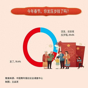 今年春节,70.4%的受访者发了压岁钱,29.6%的受访者没发,还在收压岁钱。