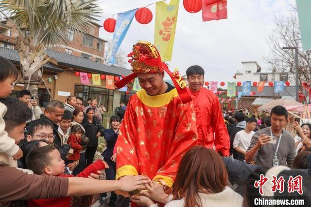 1月29日,大年初一,一场民俗巡游在江西赣州章贡区的老浮桥人文艺术村落举行,大型游龙、南狮、章贡高跷、民间鱼灯轮番上阵闹新春,众多游人驻足观看。图为一名踩着高跷手捧金元宝的“财神爷”和现场民众互动。中新社记者 刘力鑫 摄