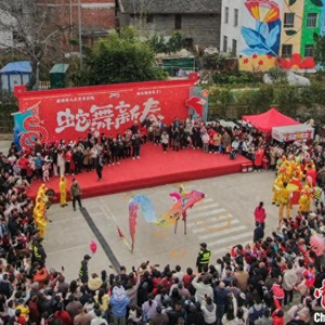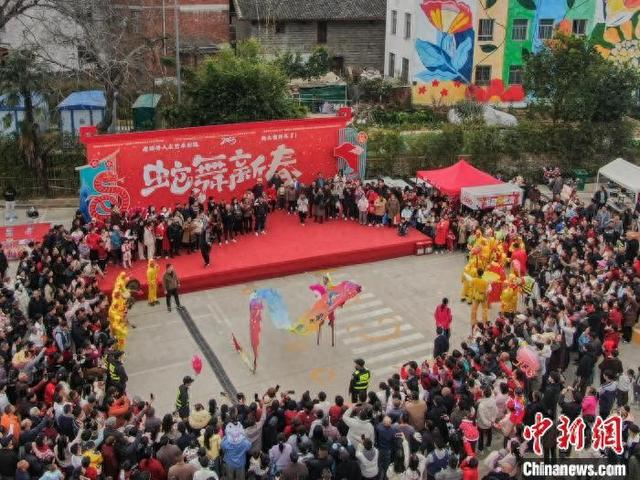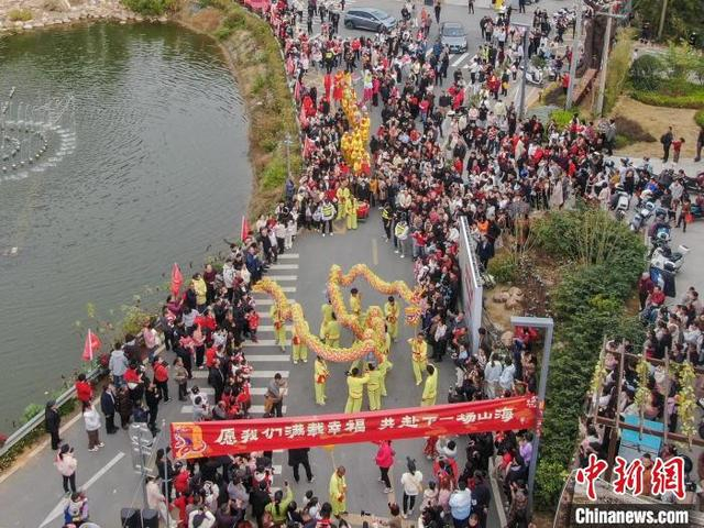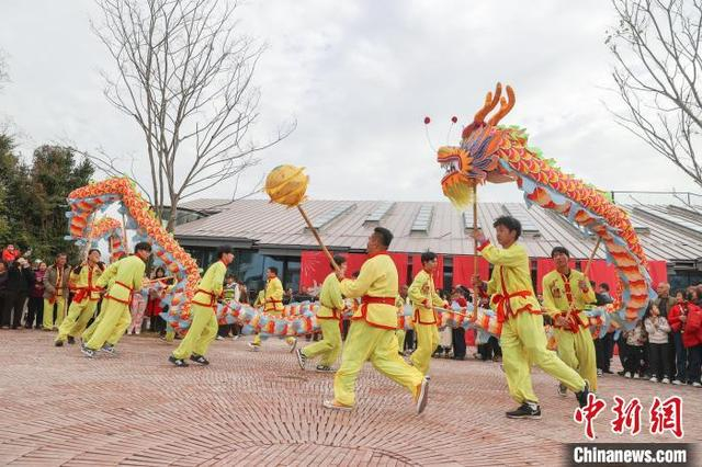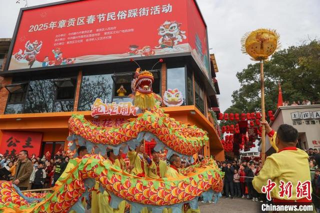 1月29日,大年初一,一场民俗巡游在江西赣州章贡区的老浮桥人文艺术村落举行,大型游龙、南狮、章贡高跷、民间鱼灯轮番上阵闹新春,众多游人驻足观看。图为大型游龙表演吸引民众观看。中新社记者 刘力鑫 摄